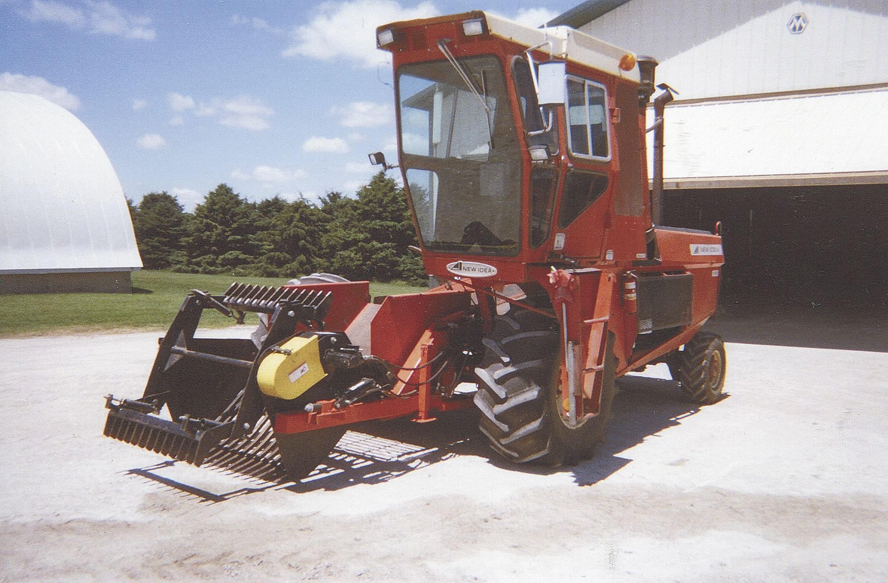 It's much more convenient to use than pull-type rock pickers because it's so maneuverable and gives me a great view in front," says Larry Recker, Oelwein, Iowa, who mounted the reel and teeth assembly off an Abco rock-picking unit on front of a New Idea 709 Uni Harvester. The 3 1/2-ft. wide, hydraulic-powered rock picker mounts in place of the Uni Harvester's husking bed and corn head. Recker built a 1/4-in. thick steel frame to support the rock picker as well as a 12-ft. long, 3-ft. wide slatted conveyor that mounts on one side of the combine.